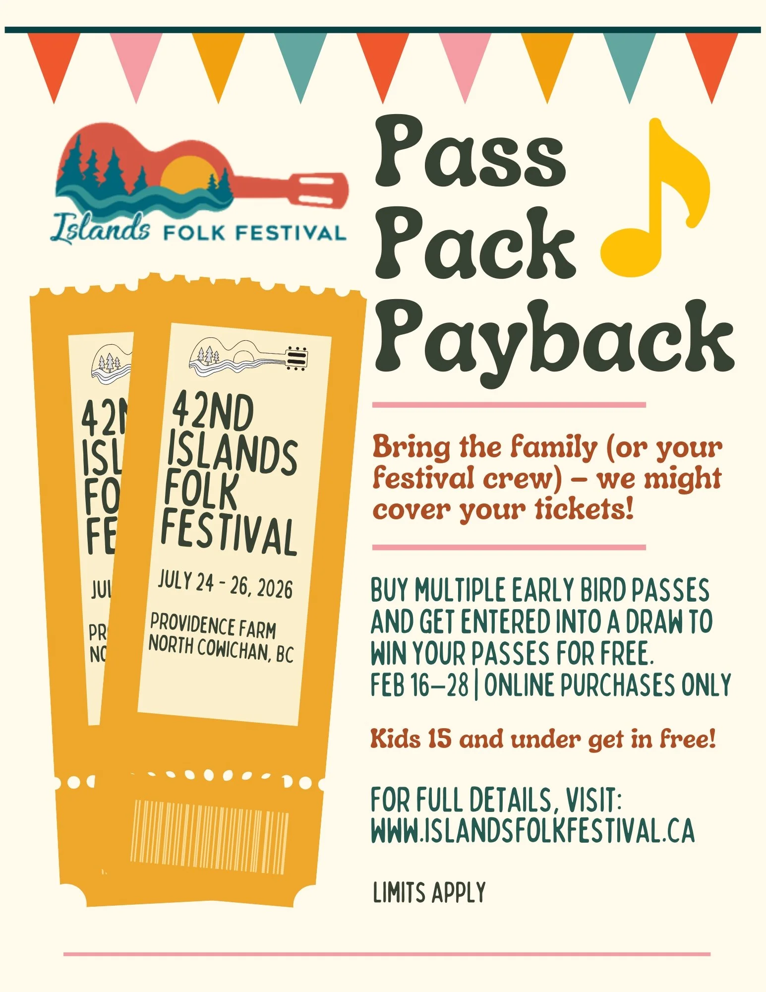 For a limited time, when you purchase multiple Early Bird Weekend Passes to the 42nd Islands Folk Festival, you’ll be entered into our Pass Pack Payback draw.